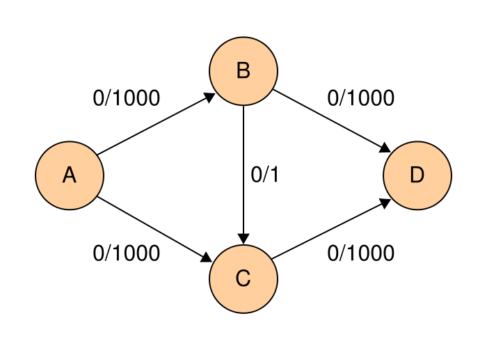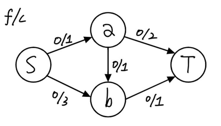 - 예를 들어, a → b 의 간선이 존재하며, 유량 f(a, b) 은 1 , 용량 c(a, b) 은 1 이라면,