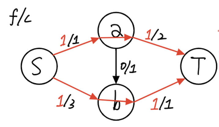 - S → a , a → b, b → T 간선의 유량이 최대치이기 때문에,