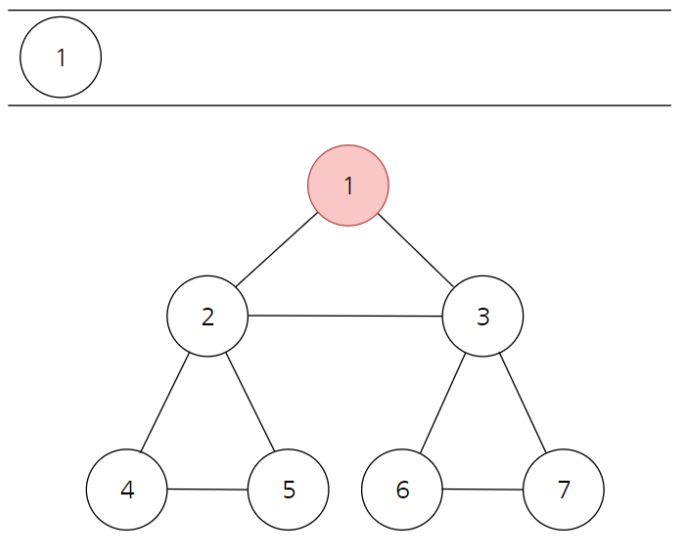 우선, BFS 시작 시, 시작 노드 1 은 큐에 삽입한 뒤, 방문 처리합니다.