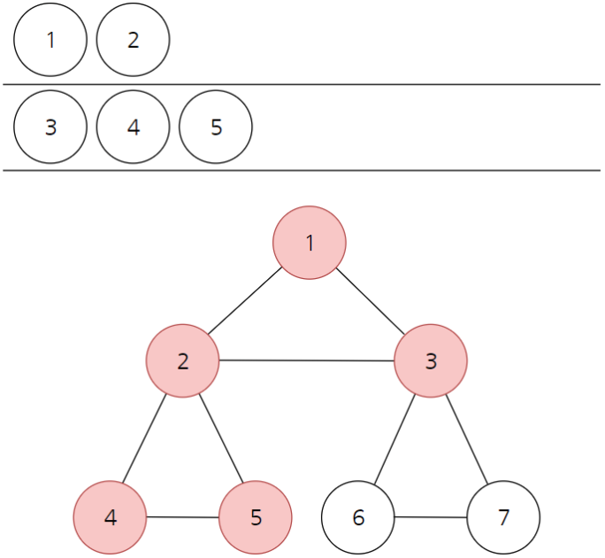 큐에서 2 를 꺼낸 뒤, 2 와 인접한 노드들 중, 방문하지 않은 노드들(4, 5)을 큐에 삽입하고, 방문 처리합니다.