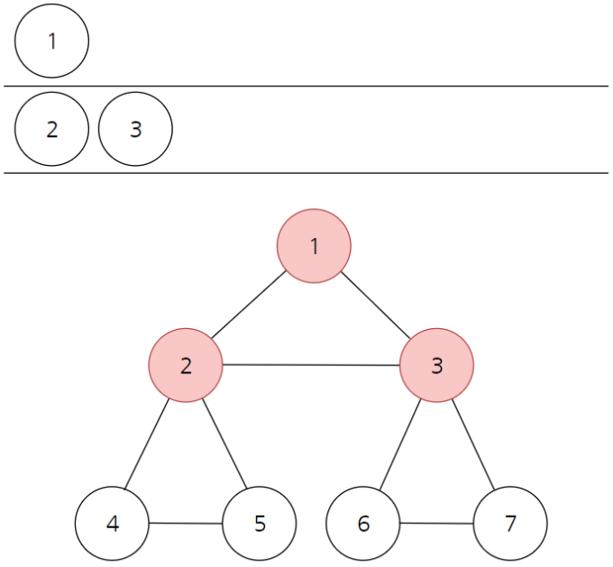 큐에서 1 을 꺼낸 뒤, 1 과 인접한 노드들 중, 방문하지 않은 노드들(2, 3)을 큐에 삽입하고, 방문 처리합니다.