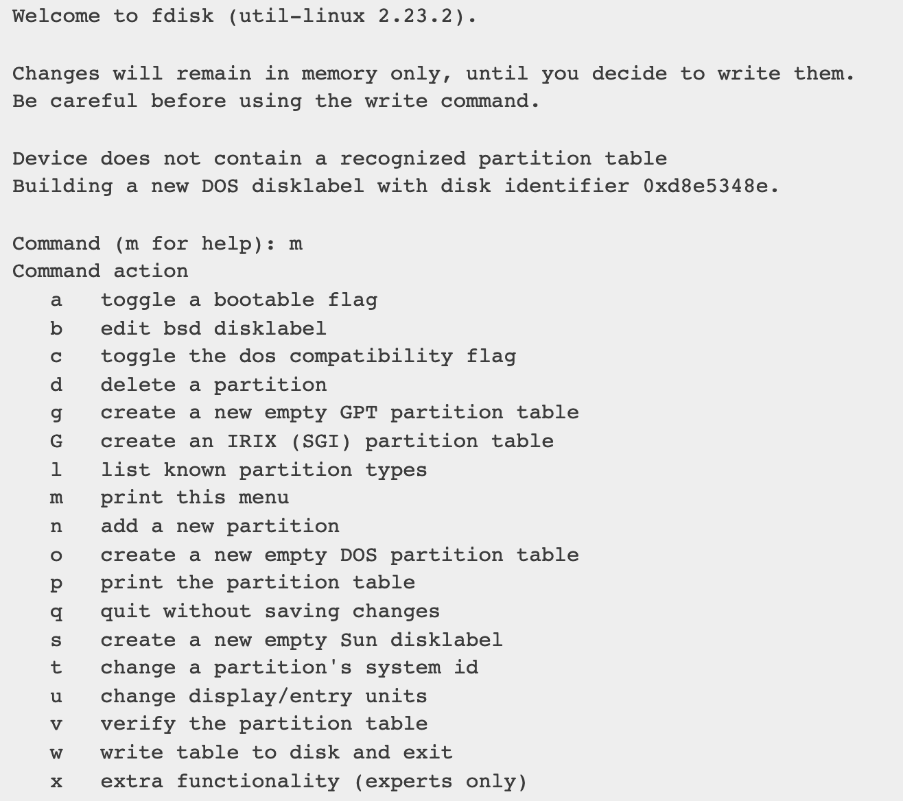 fdisk /dev/sdb해당 명령어를 입력하면, 아래와 같은 결과 화면을 확인할 수 있으며, m 을 누르면 옵션별 설명을 확인할 수 있습니다.