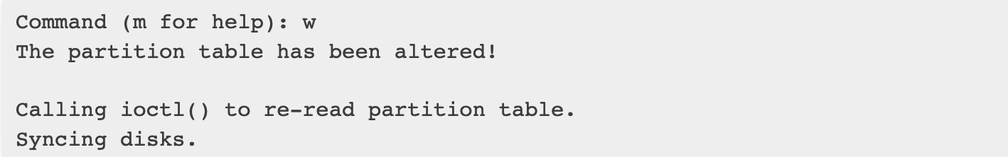 마지막으로, w 를 눌러, 지금까지 진행한 파티션 정보 설정을 저장합니다.