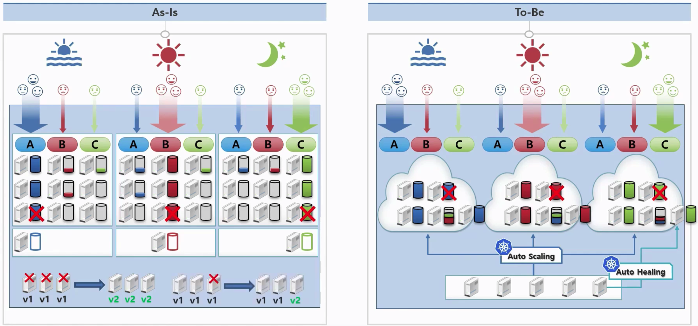 - 쿠버네티스는 오토 스케일링 기능을 통해, 4대의 서버만으로 A, B, C 서비스를 구동시킬 수 있습니다.