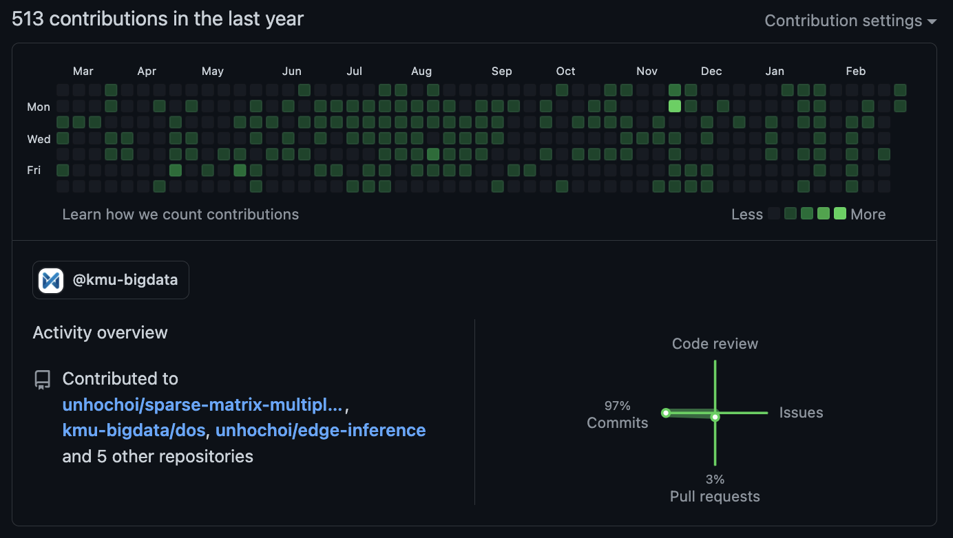 Contribution 목록, Commtis, Code review, Issues, Pull Requests 기록들을 볼 수 있습니다.