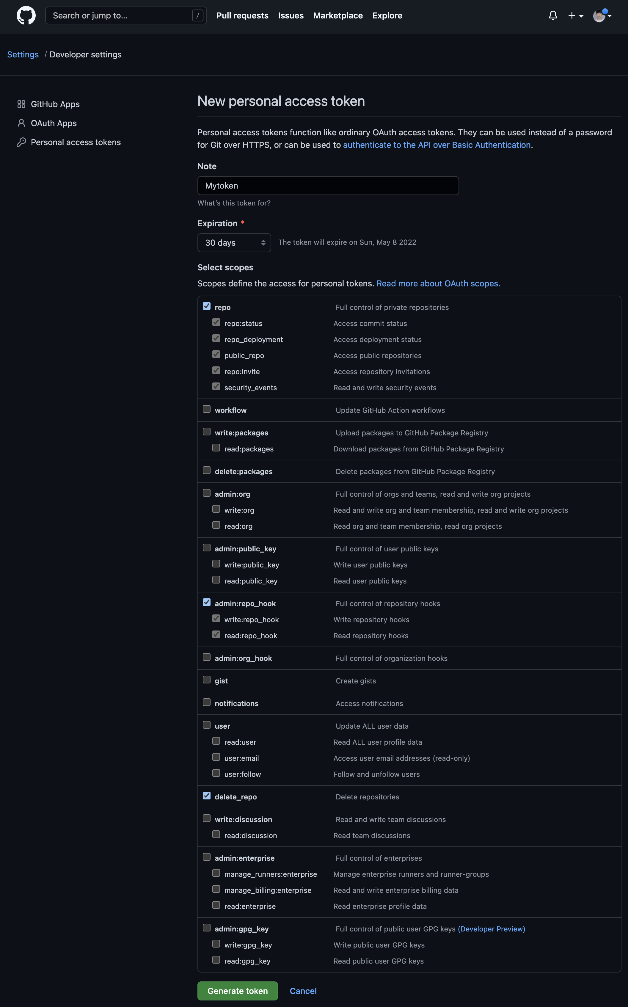 토큰명, 토큰기한, 사용범위를 선택한 뒤, 하단의 Generate token 을 클릭합니다.