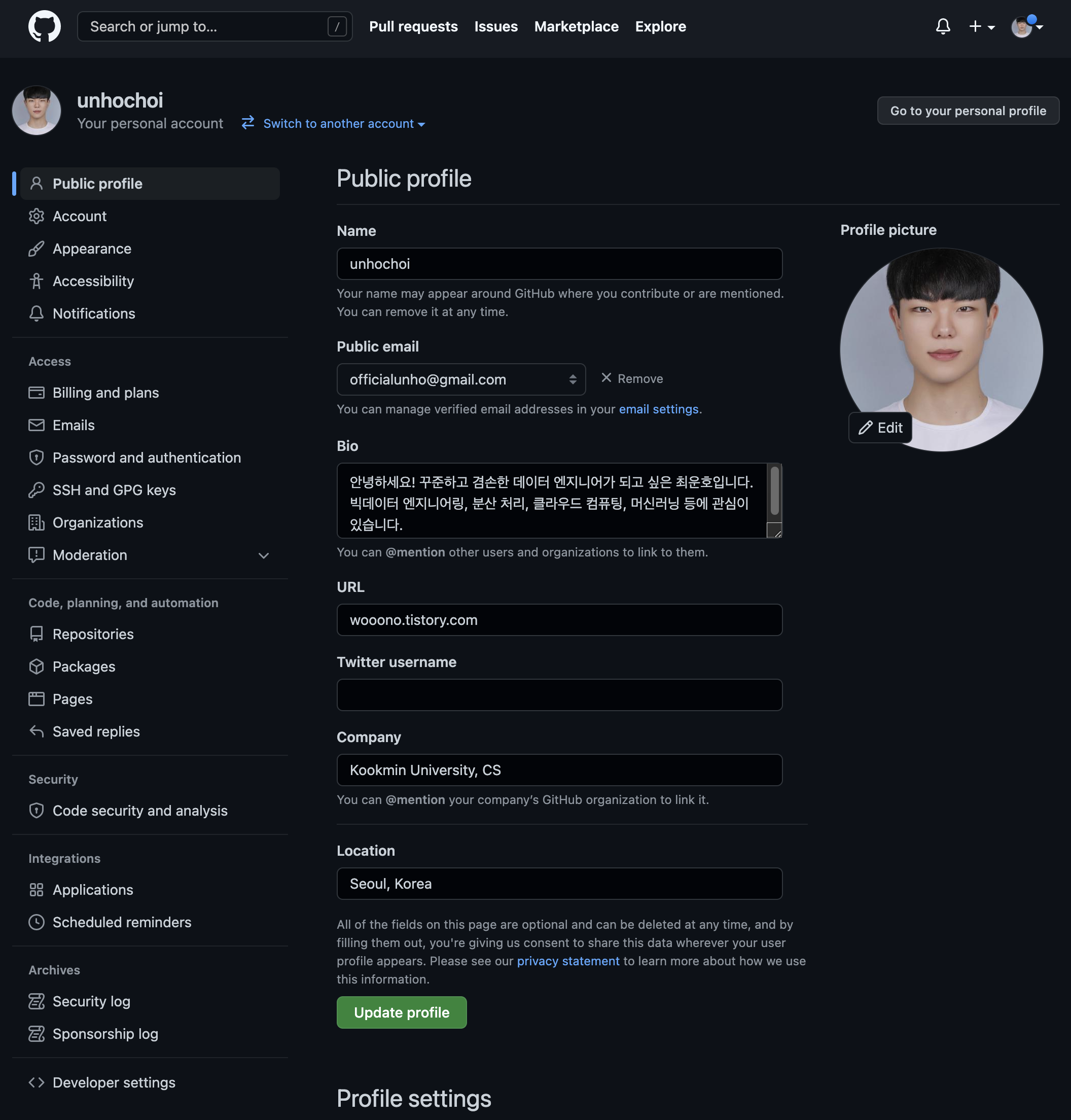 git config --global user.email "you@example.com" git config --global user.name "Your Name"git push origin main Username for 'https://github.com': Password for 'https://unhochoi@github.com': '발급 받은 토큰'