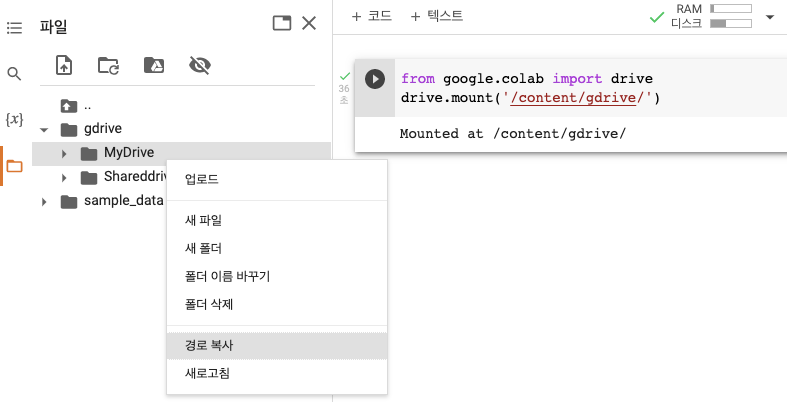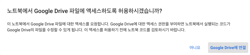 - Colab 환경에서 구글 드라이브 디렉토리에 접근하기 위해선,