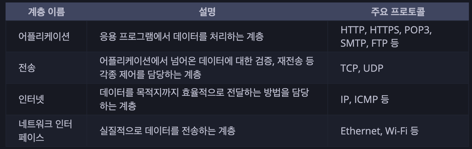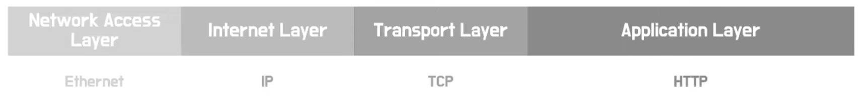 TCP/IP 4계층은, 위 그림과 같이 애플리케이션 계층, 전송 계층, 인터넷 계층, 네트워크 접근 계층으로 이루어져있습니다.