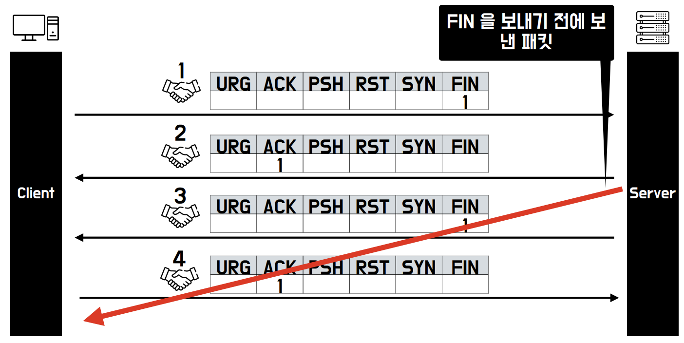 여기서도 TCP의 컨트롤 비트가 사용되며, 해당 단계에서는 ACK, FIN 플래그가 사용됩니다.