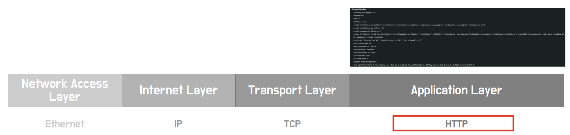 먼저, 패킷의 Application Layer 에는 HTTP Request 헤더가 들어갑니다.