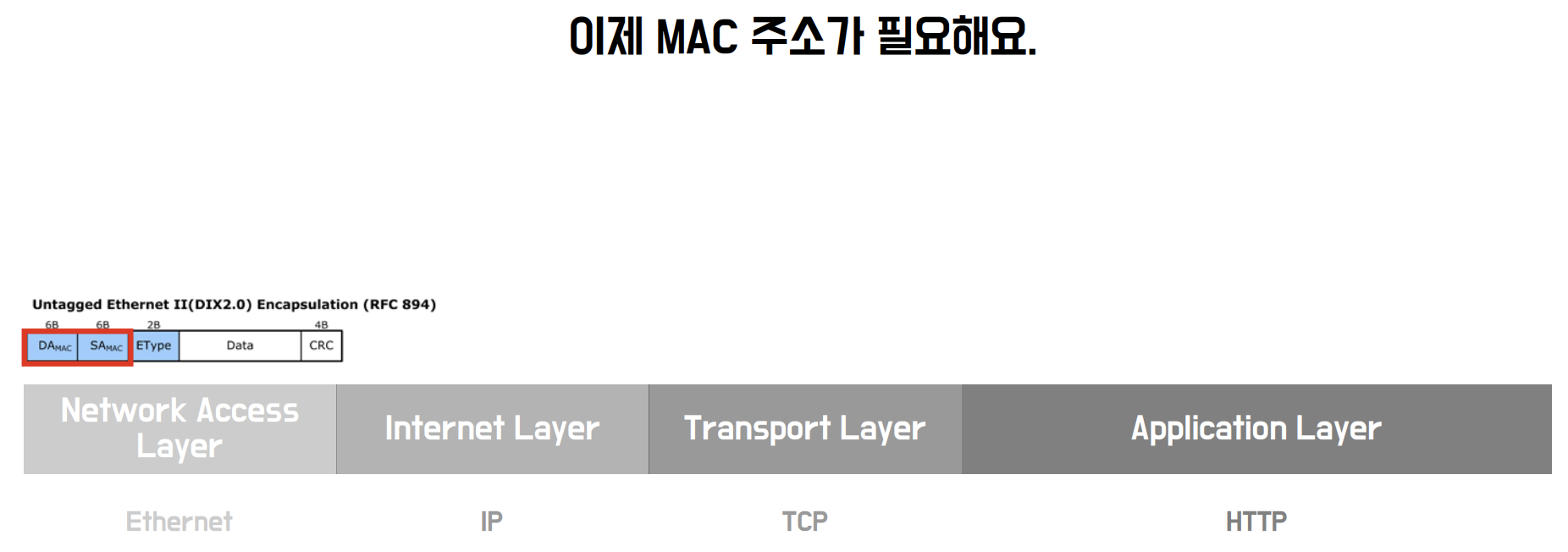 - 따라서, 라우터의 MAC 주소를 알아내기 위해, ARP 프로토콜을 사용합니다.