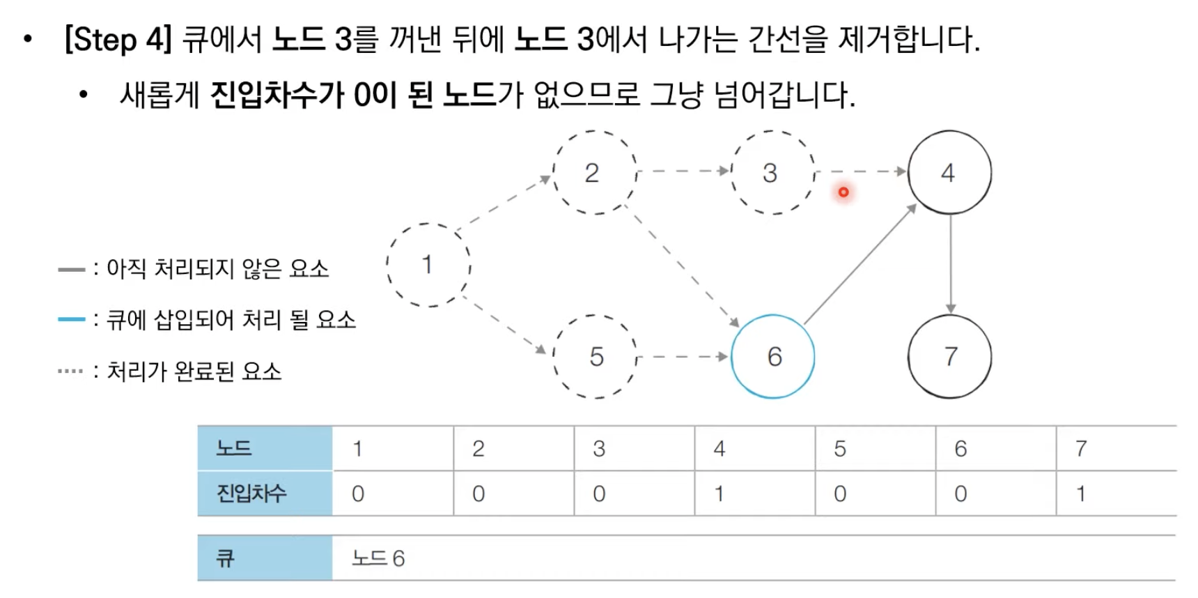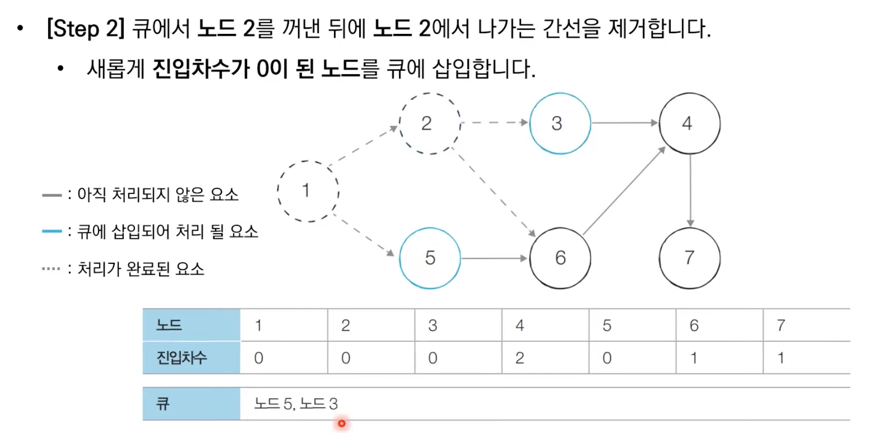 - 큐에서 원소를 꺼내, 해당 노드에서 나가는 모든 간선을 그래프에서 제거합니다.