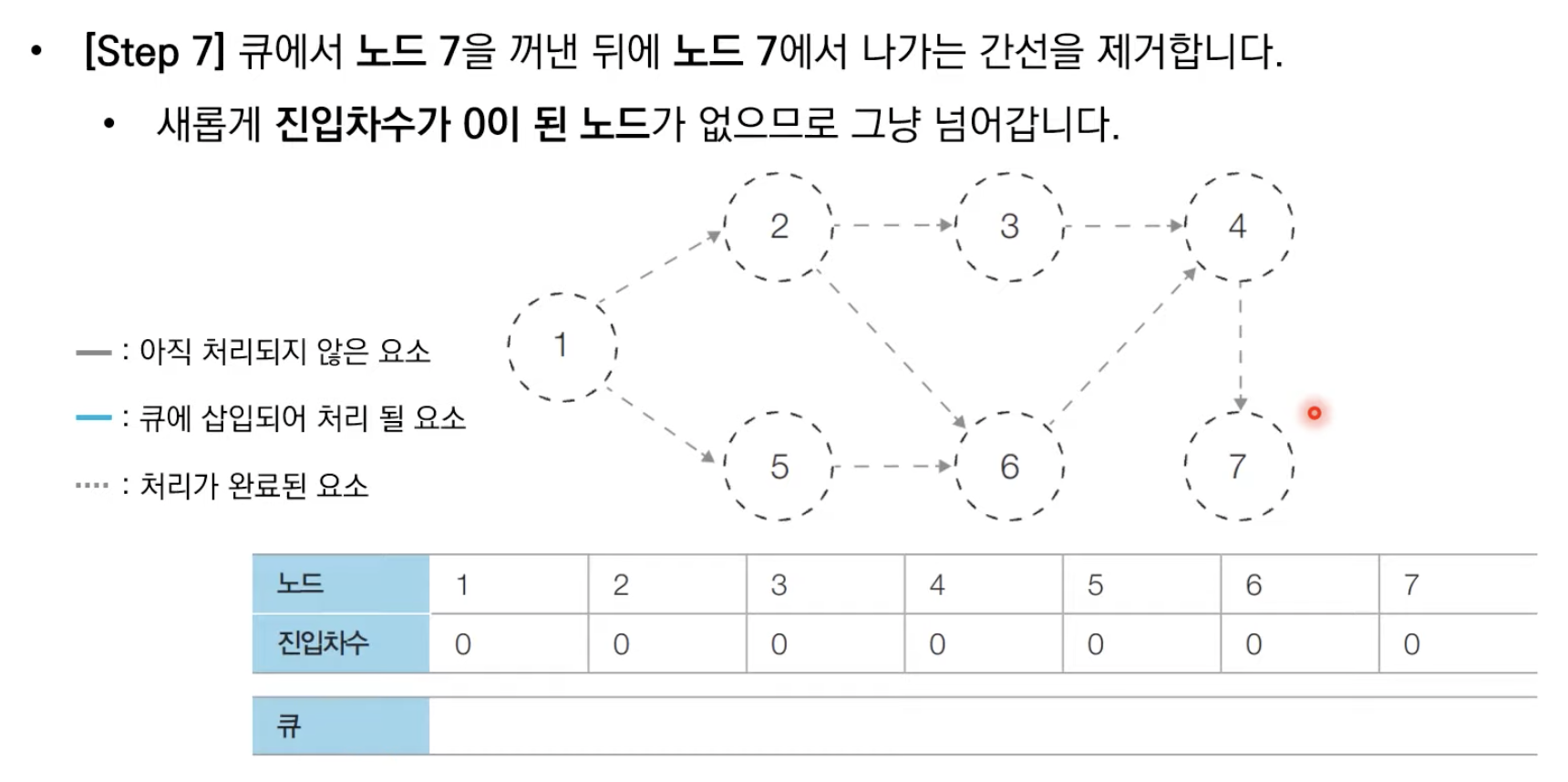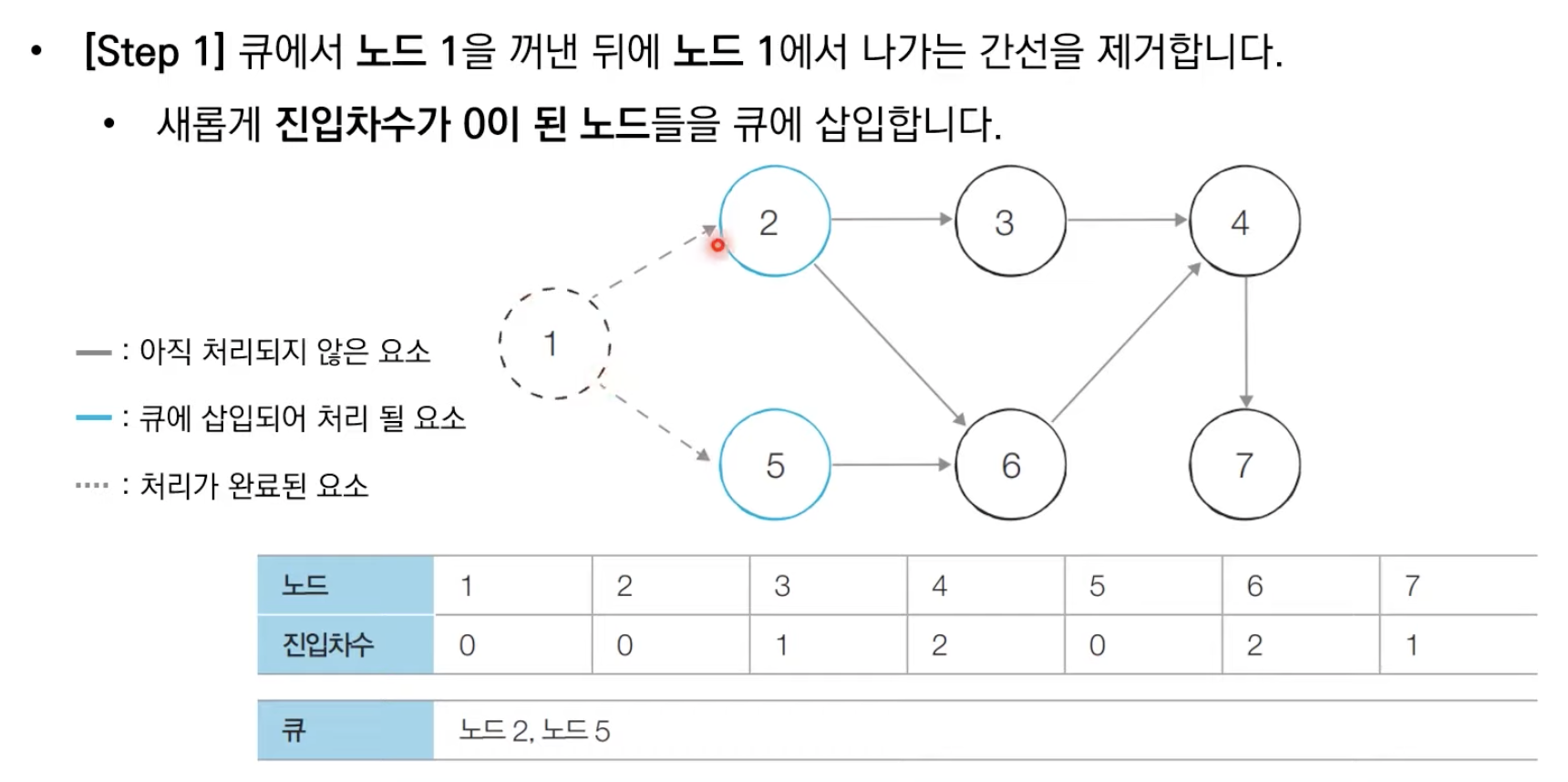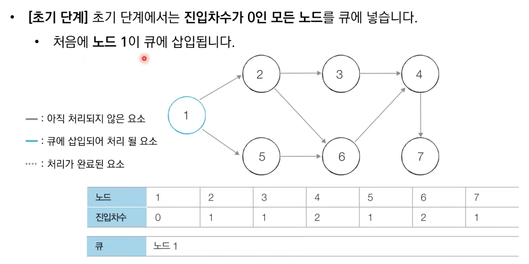 # 처음 시작할 때는 진입차수가 0인 노드를 큐에 삽입
