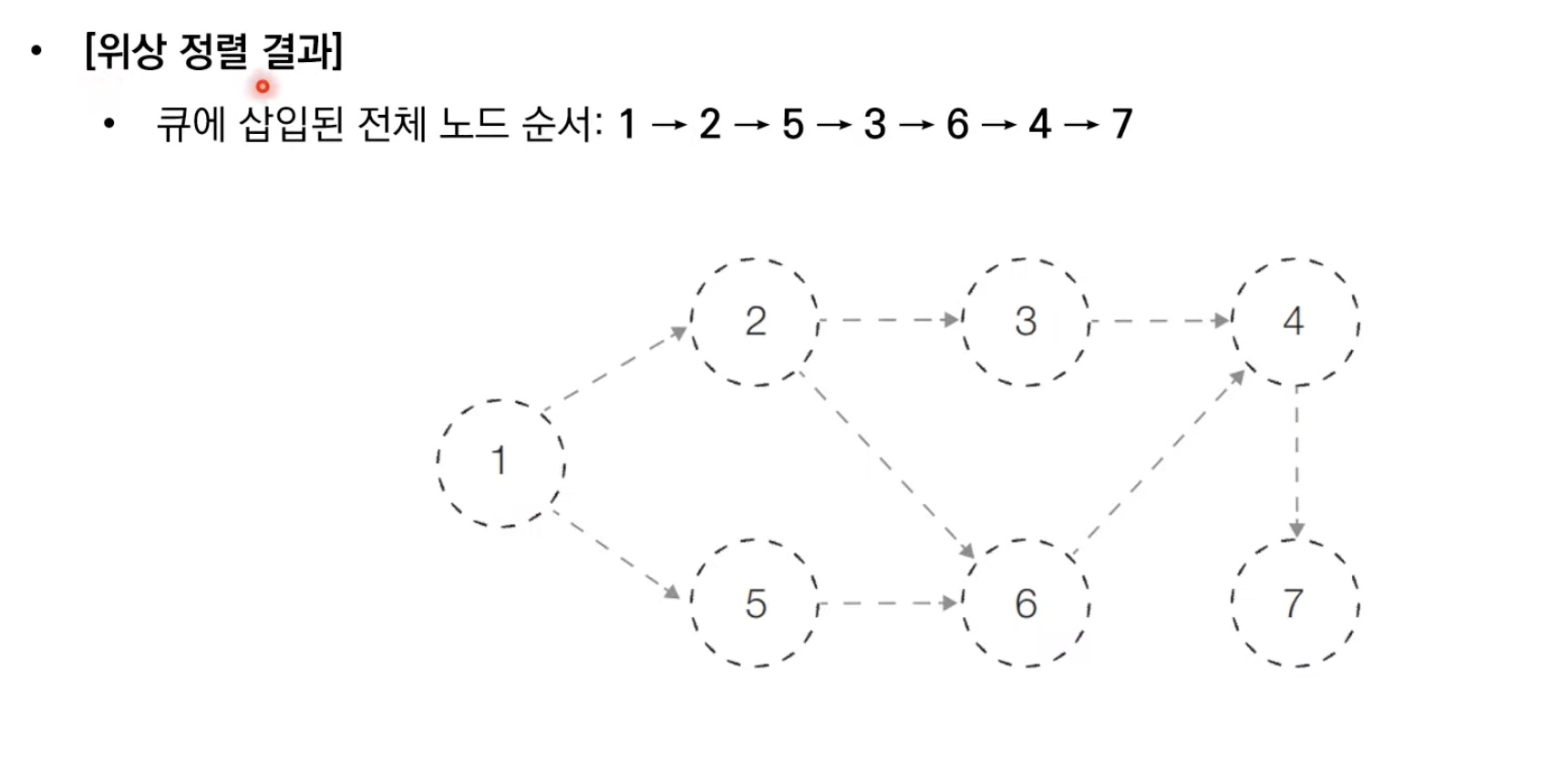 - 결과적으로 각 노드가 큐에 들어온 순서가 위상 정렬을 수행한 결과와 같습니다.
