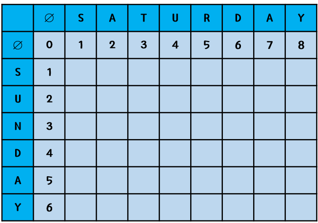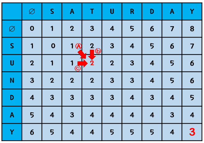 왼쪽(열)에 있는 “sunday”라는 문자열을 위쪽(행)에 있는 “saturday”로 변경하는 비용을 계산할 수 있도록 이와 같이 테이블을 구성한 것이다.