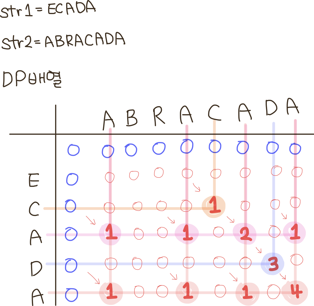 각각의 문자가 같다면, 이전 공통 부분 문자열 길이에 1을 더해 저장해나가면 됩니다.