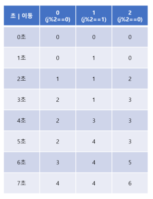 - i초에 자두가 1번 나무에서 떨어지고, 사람의 이동 횟수가 짝수라면(j % 2 == 0), 현재 1번 나무에 위치해 있다는 뜻이므로, 자두를 받아 먹을 수 있음