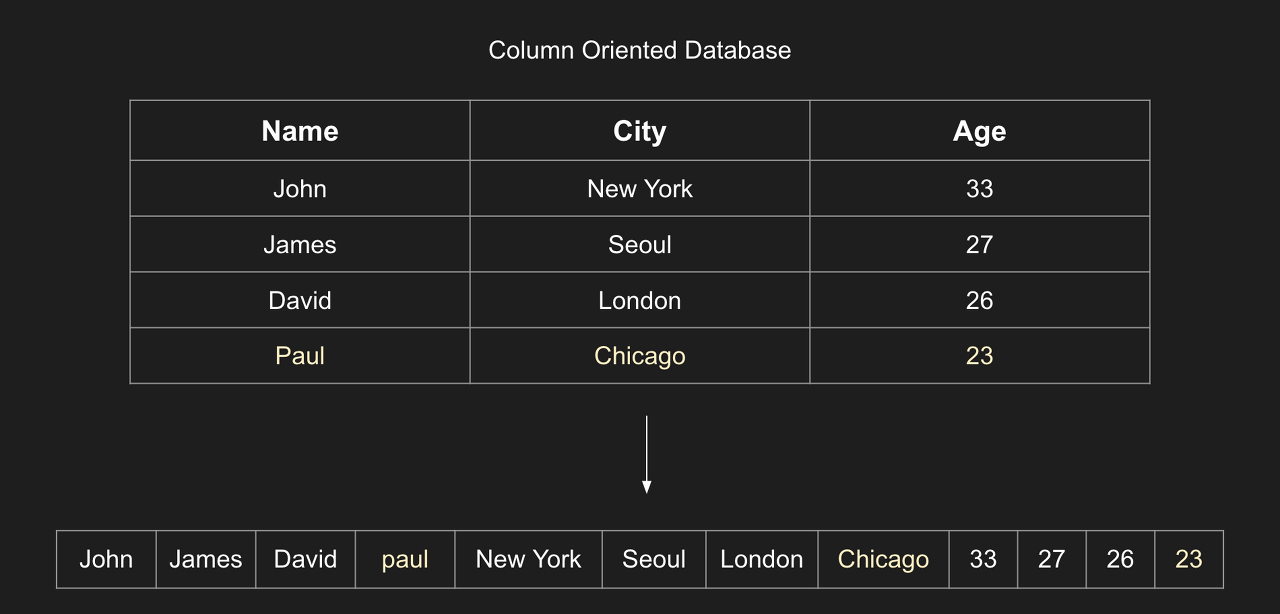 하지만, 특정 컬럼에 대한 집계는 column 단위로 묶어서 접근할 수 있으므로 효율적입니다. (필요 없는 열을 안 읽어도 됨)