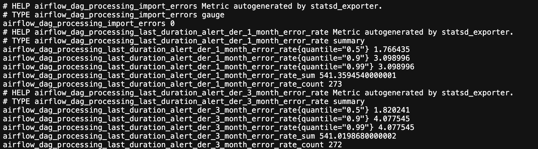 이후, 생성한 StatsD Exporter의 Service DNS에 /metrics 경로를 추가하여, StatsD Exporter가 Airflow의 Metric을 잘 받아오고 있는지 확인할 수 있습니다.