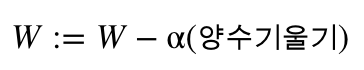 이제 비용(cost)를 최소화하는 W를 구하기 위해 W를 업데이트하는 식은 다음과 같습니다.
