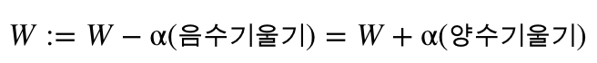 결국, 아래의 수식은 접선의 기울기가 음수거나, 양수일 때 모두 접선의 기울기가 0인 방향으로 W의 값을 조정합니다.