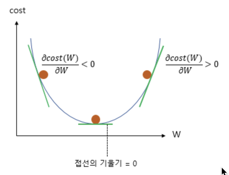 즉, cost가 최소화가 되는 지점은 접선의 기울기가 0이 되는 지점이며, 또한 미분값이 0이 되는 지점입니다.