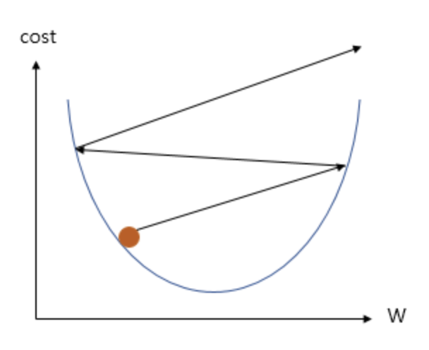 위의 그림은 학습률 α가 지나치게 높은 값을 가질 때, 접선의 기울기가 0이 되는 WW를 찾아가는 것이 아니라 W의 값이 발산하는 상황을 보여줍니다.