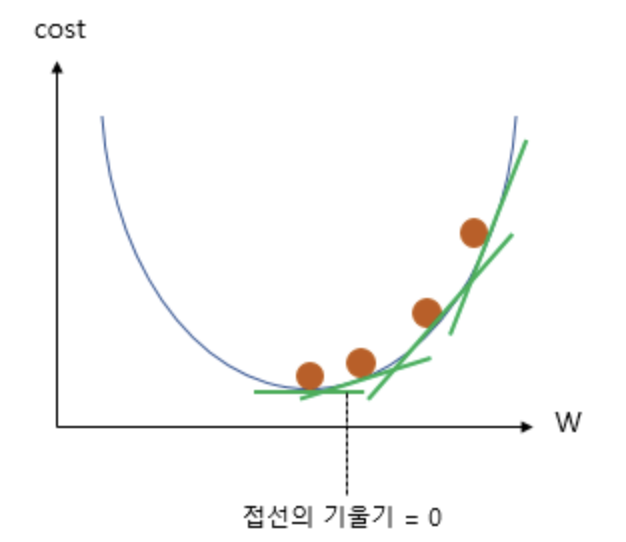 경사 하강법의 아이디어는 비용 함수(Cost function)를 미분하여 현재 W에서의 접선의 기울기를 구하고, 접선의 기울기가 낮은 방향으로 W의 값을 변경하고 다시 미분하고 이 과정을 접선의 기울기가 0인 곳을 향해 W의 값을 변경하는 작업을 반복하는 것에 있습니다.