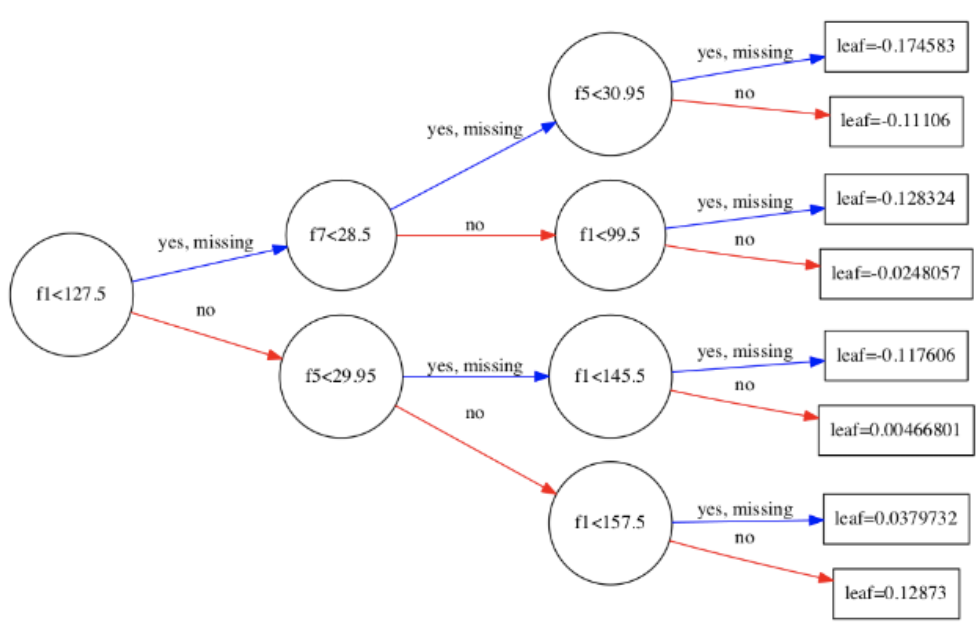 import xgboost as xgb import matplotlib.pyplot as plt # num_trees : 그림을 여러개 그릴시 그림 번호 # rankdir : 트리의 방향, 디폴트는 위아래 방향 # rankdir="LR" : 왼쪽에서 오른쪽 방향으로 트리를 보여준다. xgb.plot_tree(my_model, num_trees=0, rankdir='LR') fig = plt.gcf() fig.set_size_inches(150, 100) # 이미지 저장하고 싶다면 # fig.savefig('tree.png') plt.show()