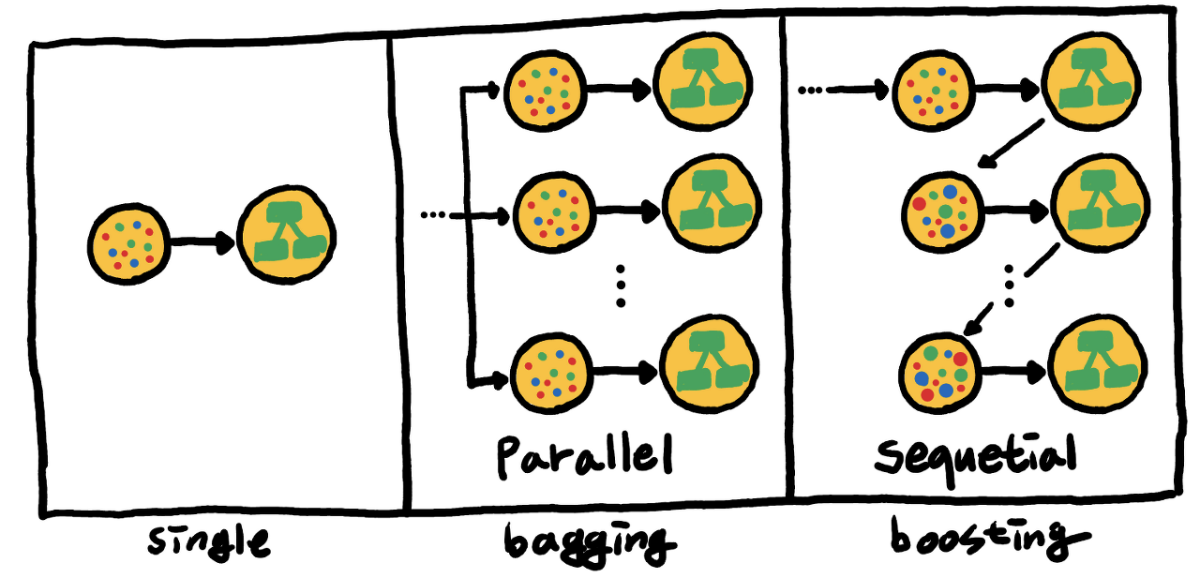 - 위 그림에서 나타내는 바와 같이, 배깅은 병렬로 학습하는 반면, 부스팅은 순차적으로 학습합니다.