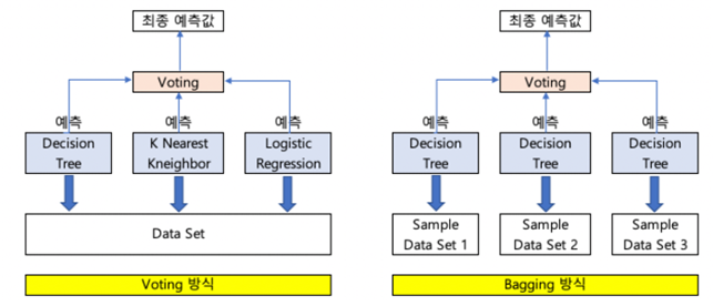 - Voting 은 다른 알고리즘 기반의 여러 Decision Tree 를 사용합니다.